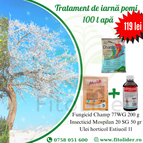 Pachetul Champ® 77 WG + Mospilan® OIl pentru 100 litri de apă este creat pentru pomicultori, cu recomandarea de a fi aplicat iarna, în intervalul de repaus vegetal. Pachetul conține ulei horticol, insecticid și fungicid.